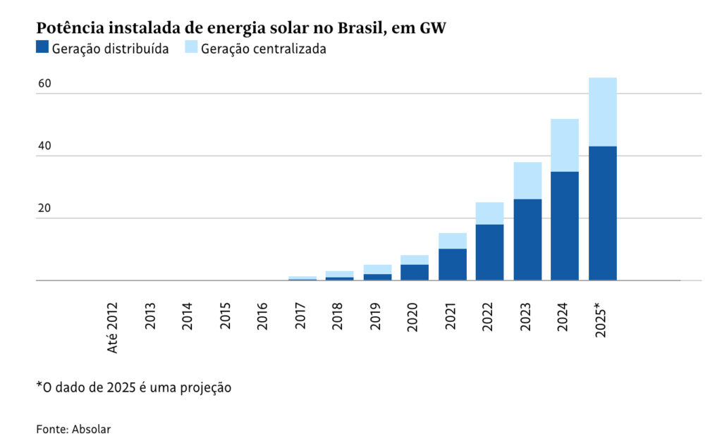 Ao todo, o Brasil tem 52,2 GW de potência instalada de fonte solar, 21% de toda a matriz elétrica nacional —a segunda maior fonte.