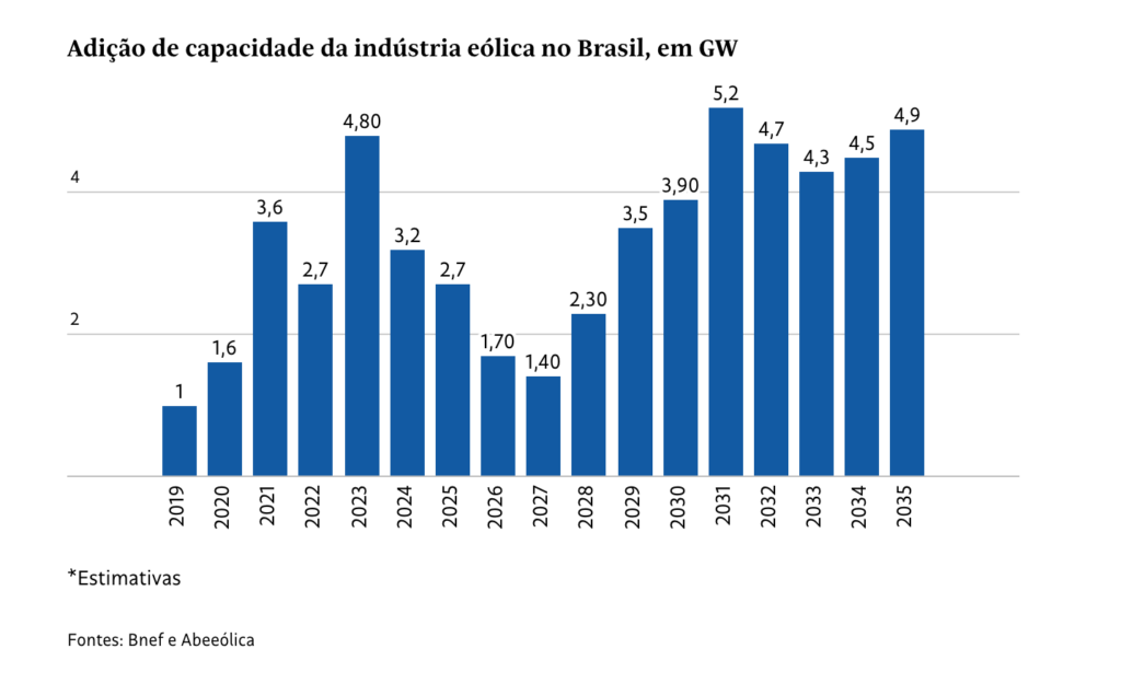 De qualquer forma, a eventual retomada deve ter reflexos só em 2028, segundo projeções da BloombergNEF. Até lá, a expectativa é de queda na capacidade adicionada de energia eólica no país.